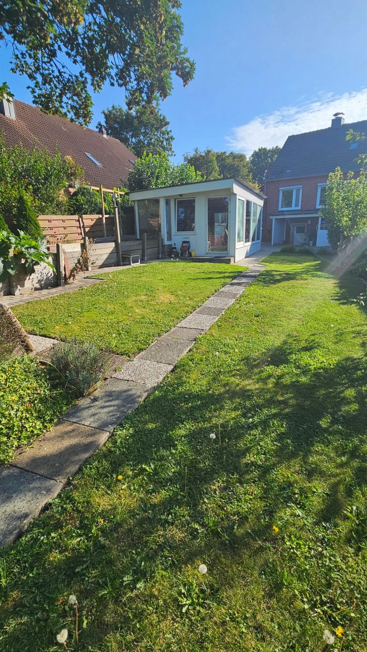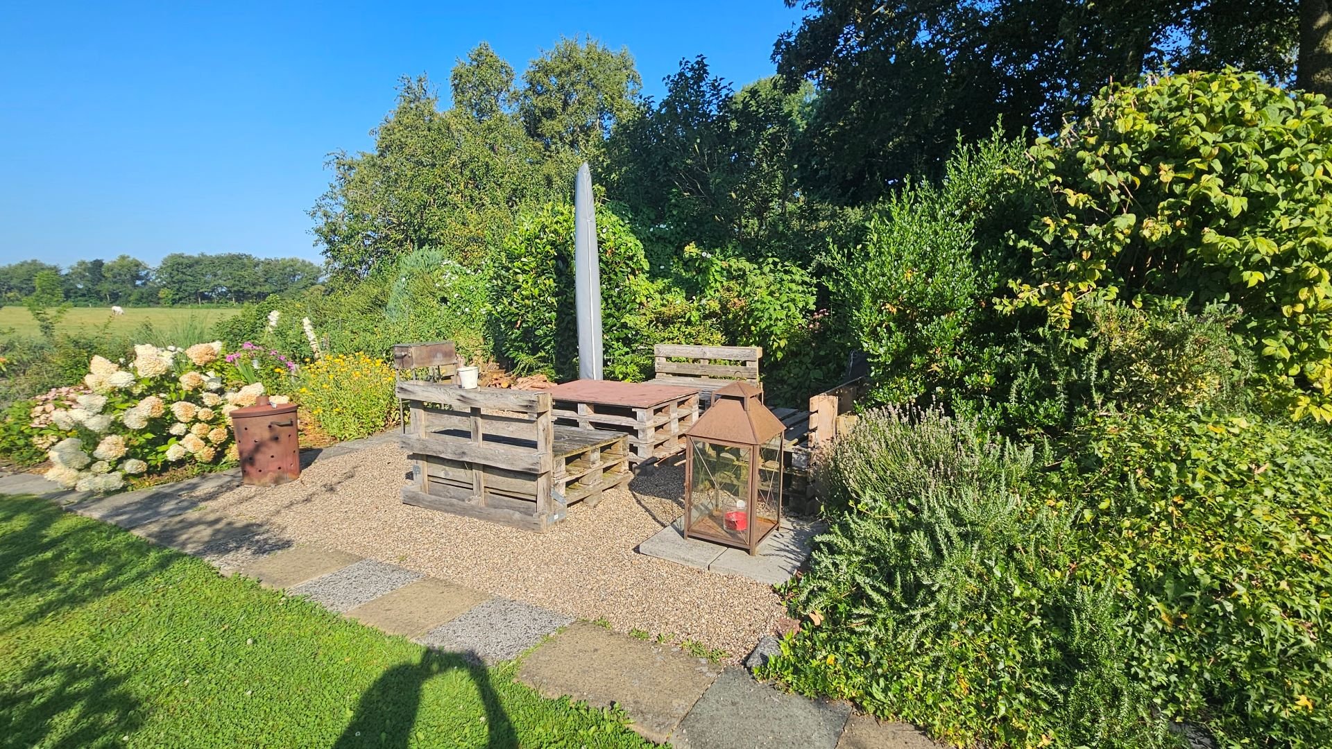 Hinter dem Haus befindet sich ein überdachter Bereich, der auch an regnerischen Tagen einen geschützten Platz zum Sitzen bietet. Da im Haus nicht geraucht werden darf, steht hier ein Aschenbecher bereit; für kühlere Tage sorgt eine Infrarotheizung für angenehme Wärme. Von dort gelangen Sie in den Garten mit einer Rasenfläche, die von Beeten und Büschen eingerahmt wird nicht perfekt, aber liebevoll gepflegt und mit kleinen, hübsch bepflanzten Bereichen.