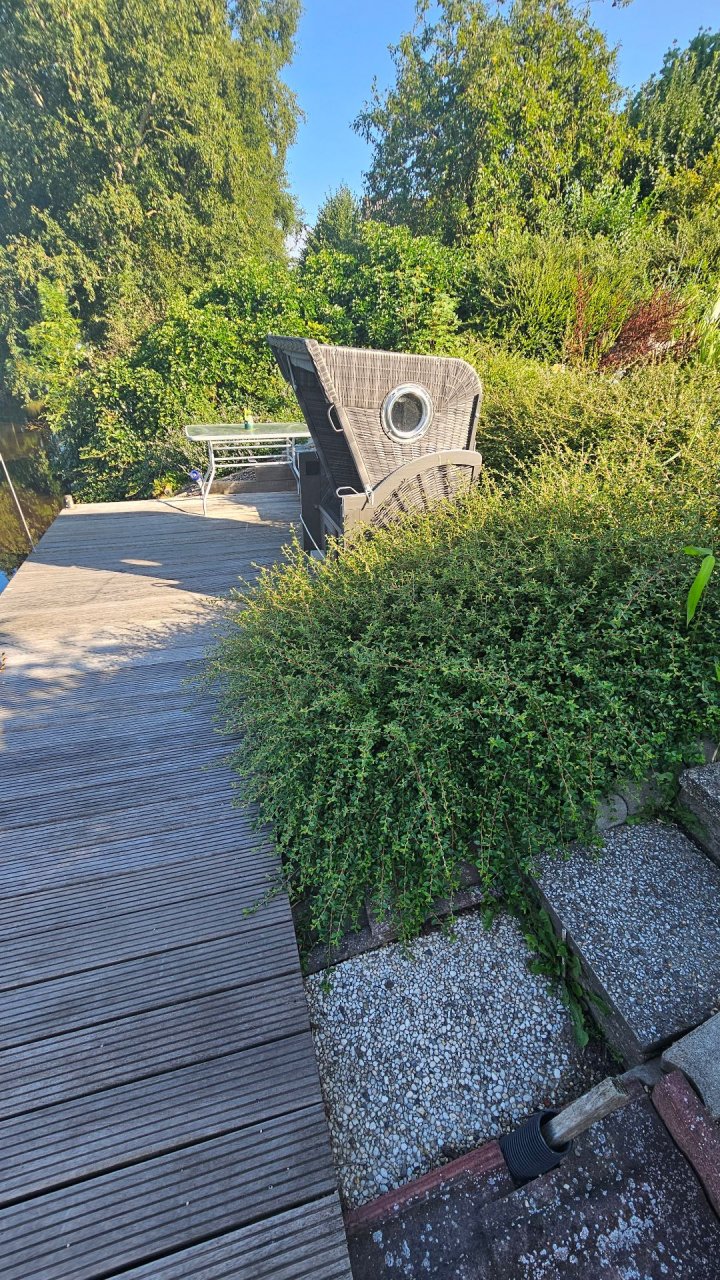 Im hinteren Teil des Gartens lädt eine gemütliche Sitzgruppe mit Sonnenschirm zum Entspannen ein. Noch ein Stück weiter öffnet sich der Blick zum Wasser. Am eigenen Bootssteg können Sie im Strandkorb sitzen, die Ruhe genießen und den Sonnenuntergang über den weiten Feldern beobachten ein echtes Highlight des Hauses.